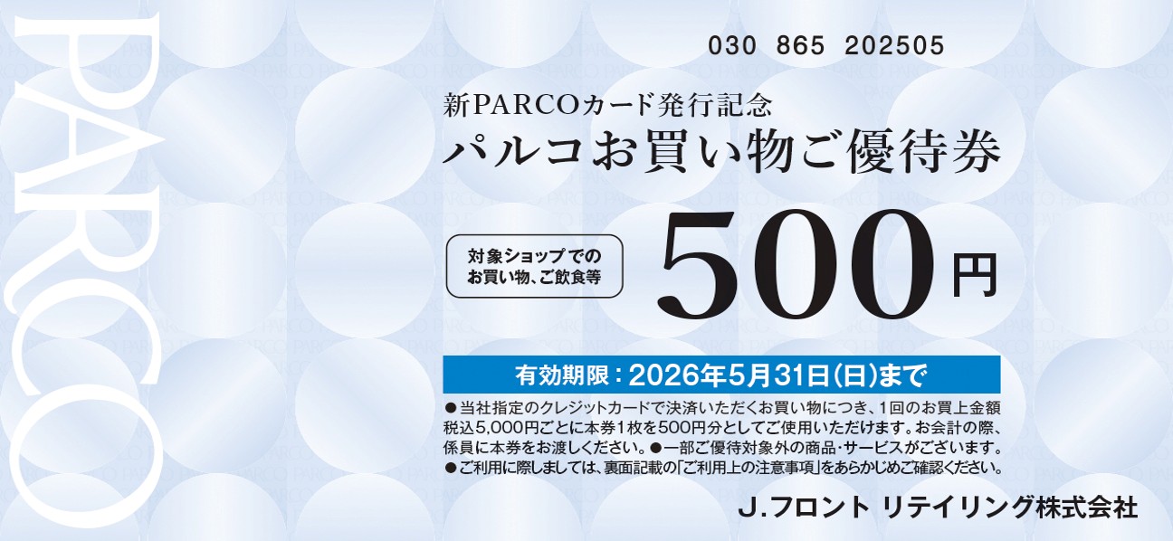 PARCO店頭でのお買い物でご使用いただける「新PARCOカード発行記念パルコお買い物ご優待券」を発行